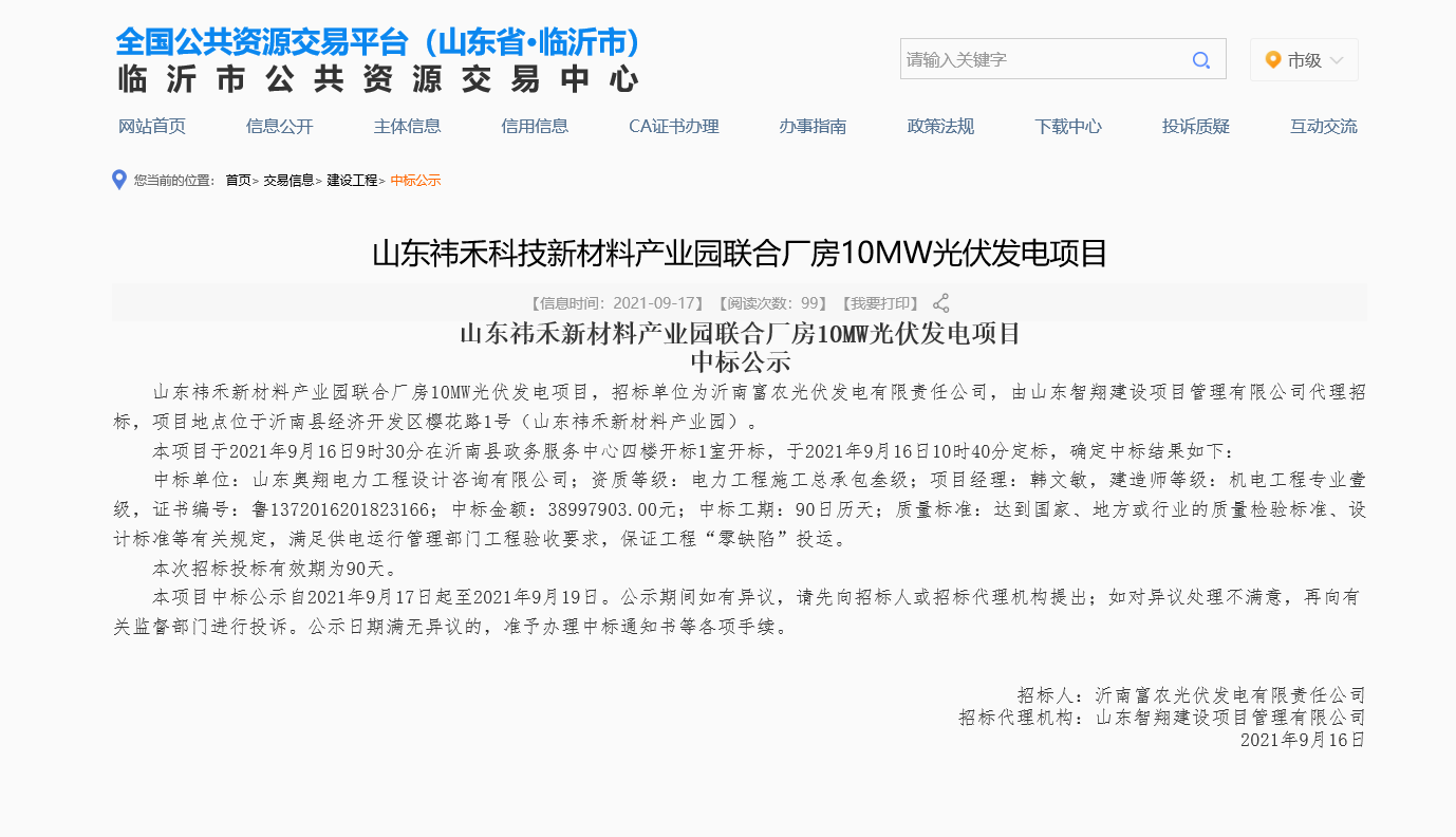 水發(fā)奧翔設計公司成功中標山東祎禾新材料產業(yè)園10MW光伏發(fā)電EPC項目