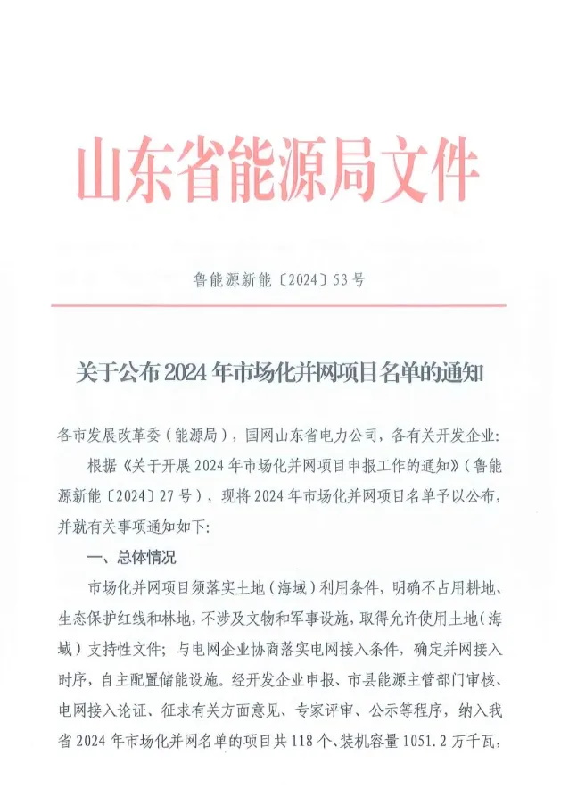 日前,山東省能源局發(fā)布《關(guān)于公布2024年市場化并網(wǎng)項目名單的通知》,通知提到,納入山東省2024年市場化并網(wǎng)名單的項目共118個、裝機容量1051.2萬千瓦,其中,光伏項目117個共計1046.2萬千瓦。